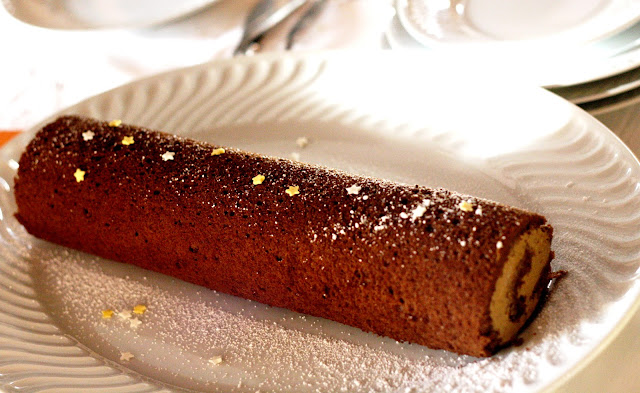 pão de ló recheado de chocolate de leite com cobertura de chocolate e aplicações em massa de