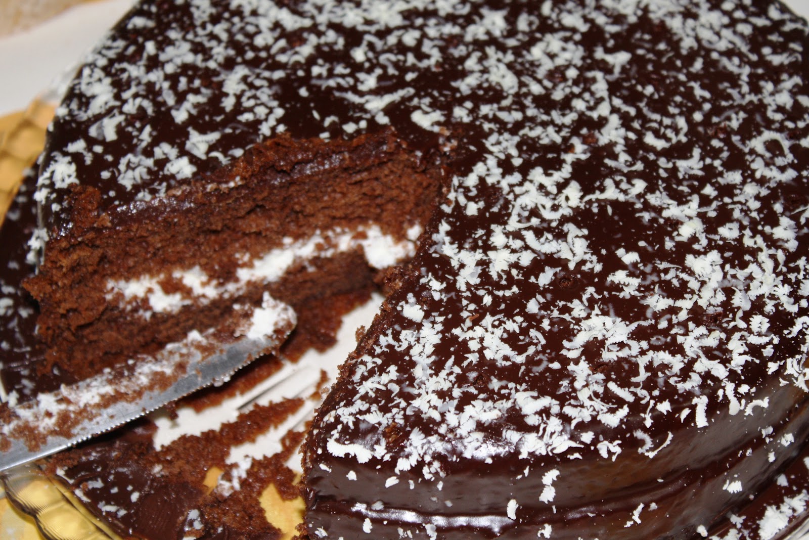 bolo de chocolate com recheio de chantilly e cobertura em chocolate de leite e raspas de chocolate branco.