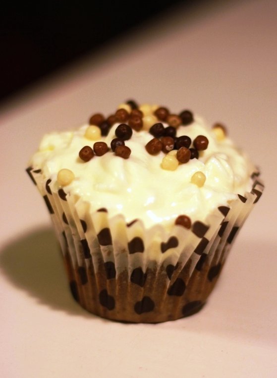 cupcake de chocolate com cobertura de creme queijo e pepitas de 3 chocolates